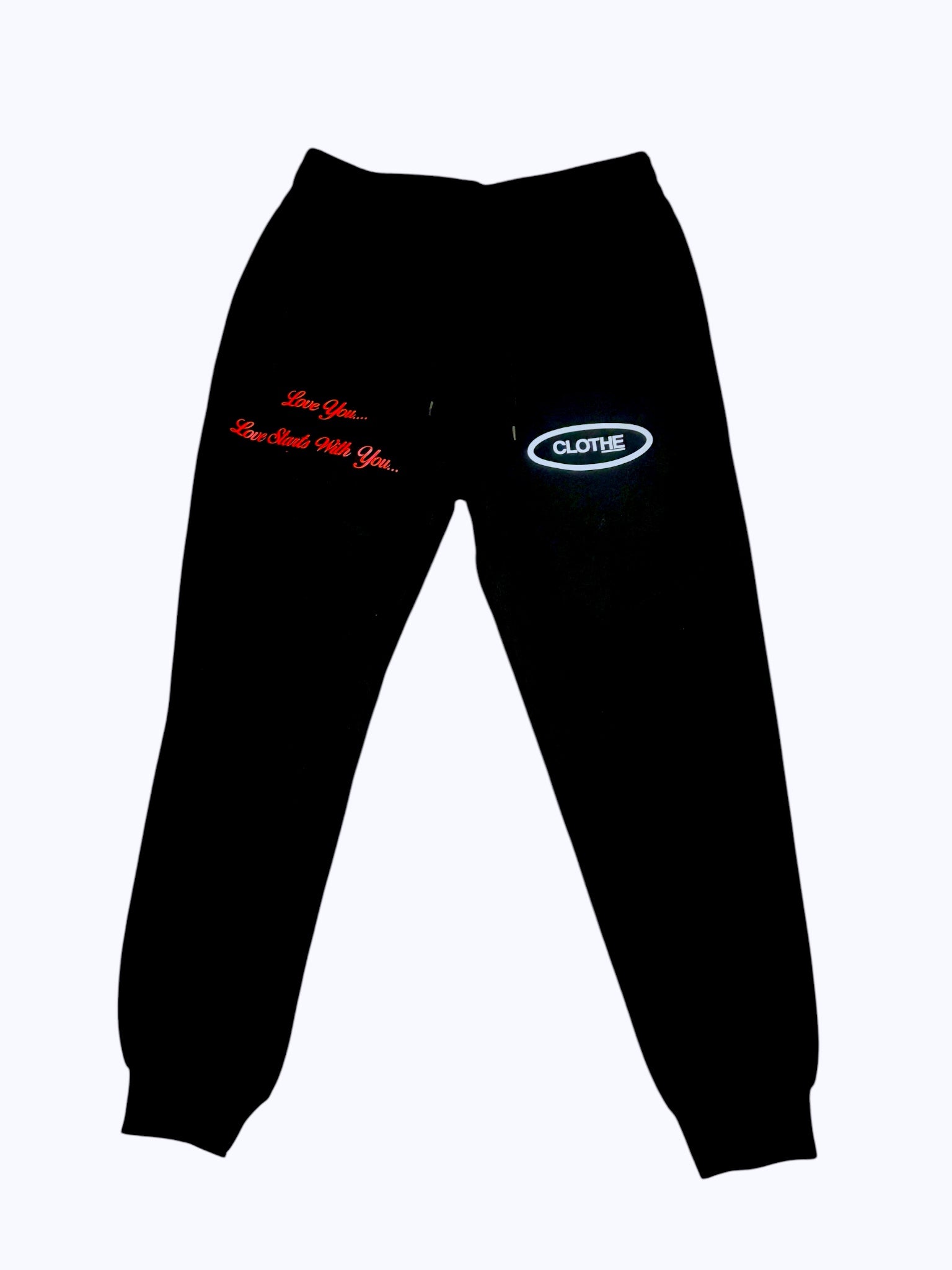 THE Love You... Love Starts With You... Black Sweatpants FEATURES ON ONE SIDE THE STATEMENT "LOVE YOU...LOVE STARTS WITH YOU..." IN RED VINYL ALONG WITH THE STATEMENT "MADE WITH LOVE" AND HEART DESIGN IN RED VINYL AND WHITE 3M REFLECTIVE VINYL PRINT AND THE NEW CLOTHE_ LOGO IN WHITE 3M REFLECTION.