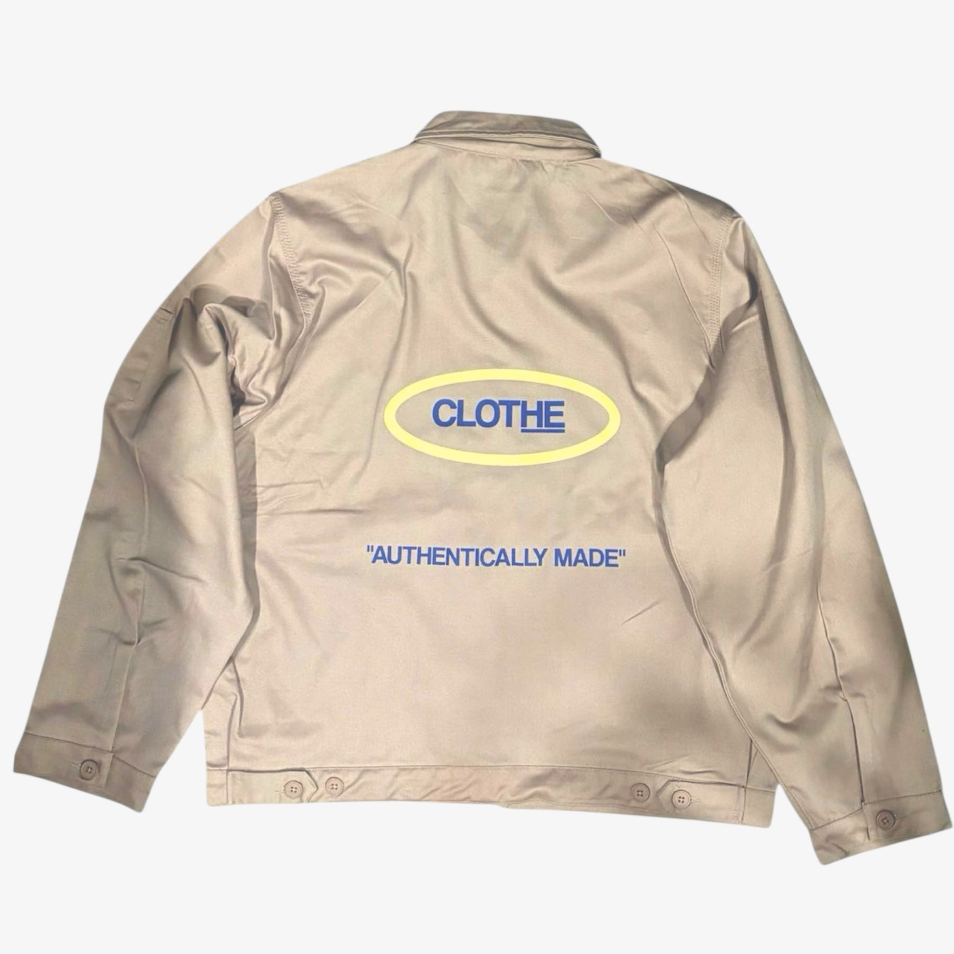 THE "BY FAITH" Tan Work Jacket FEATURES ON ONE SIDE The scripture 2 Corinthians 5:7 "Walk by Faith, Not by Sight." THE NEW CLOTHE_ HALO LOGO IN Pale Yellow/ Royal blue Vinyl with the Signature Phrase "Authentically Made 1 of 1" and New Clothe_ Halo Logo on the Back with Pale Yellow and Royal Blue Vinyl.
