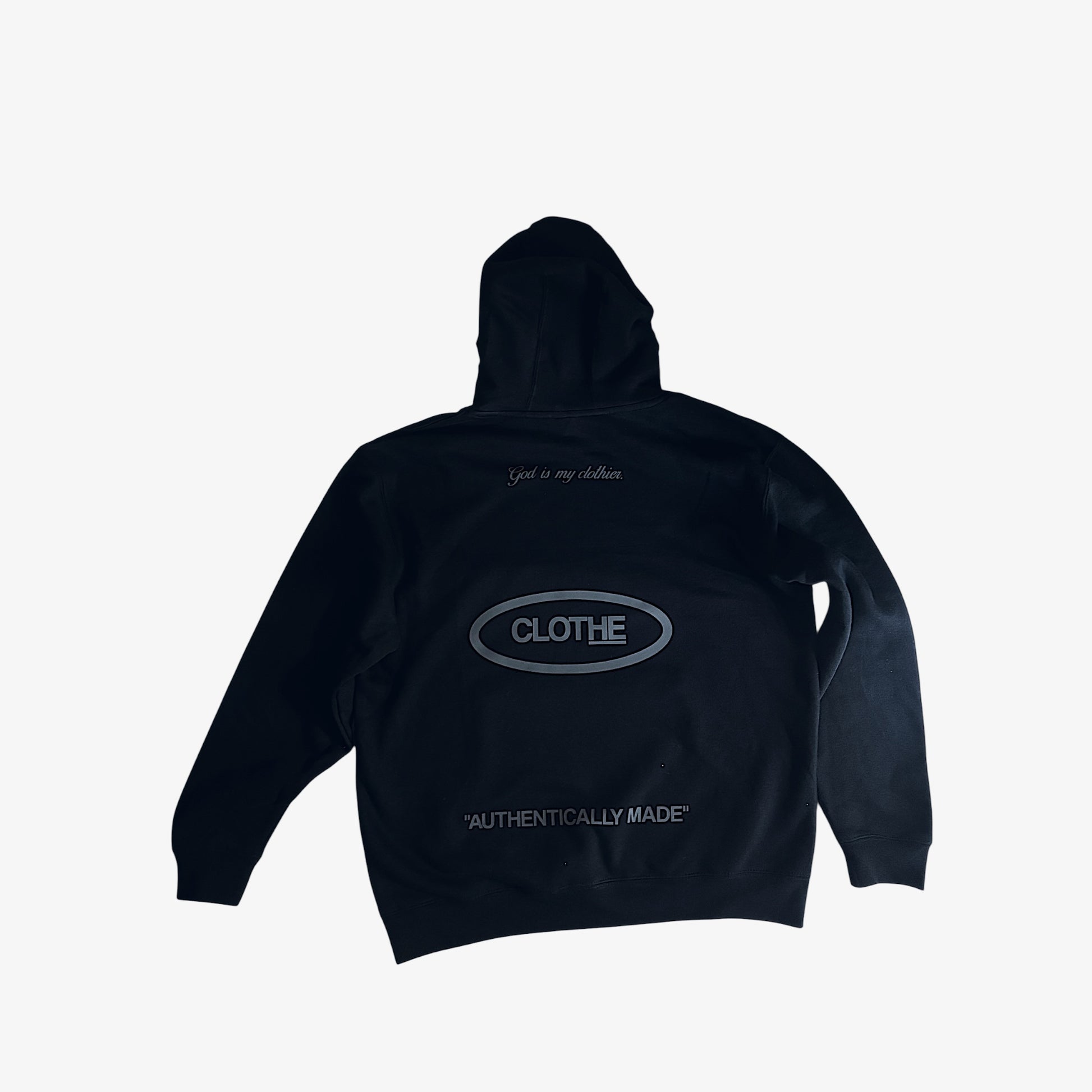 The "God is my clothier." All Black 3M Reflective mid-weight Hoodie featuring a kangaroo front pocket, relaxed fit style, and metal eyelets. Also Features: Logos in black 3M reflective vinyl on the front and back with the statement "God is my clothier." in Black 3M Reflective Vinyl with the new Clothe_ Halo Logo in Black 3m and Logo "Authentically Made" on the Back with Black 3M reflective vinyl.