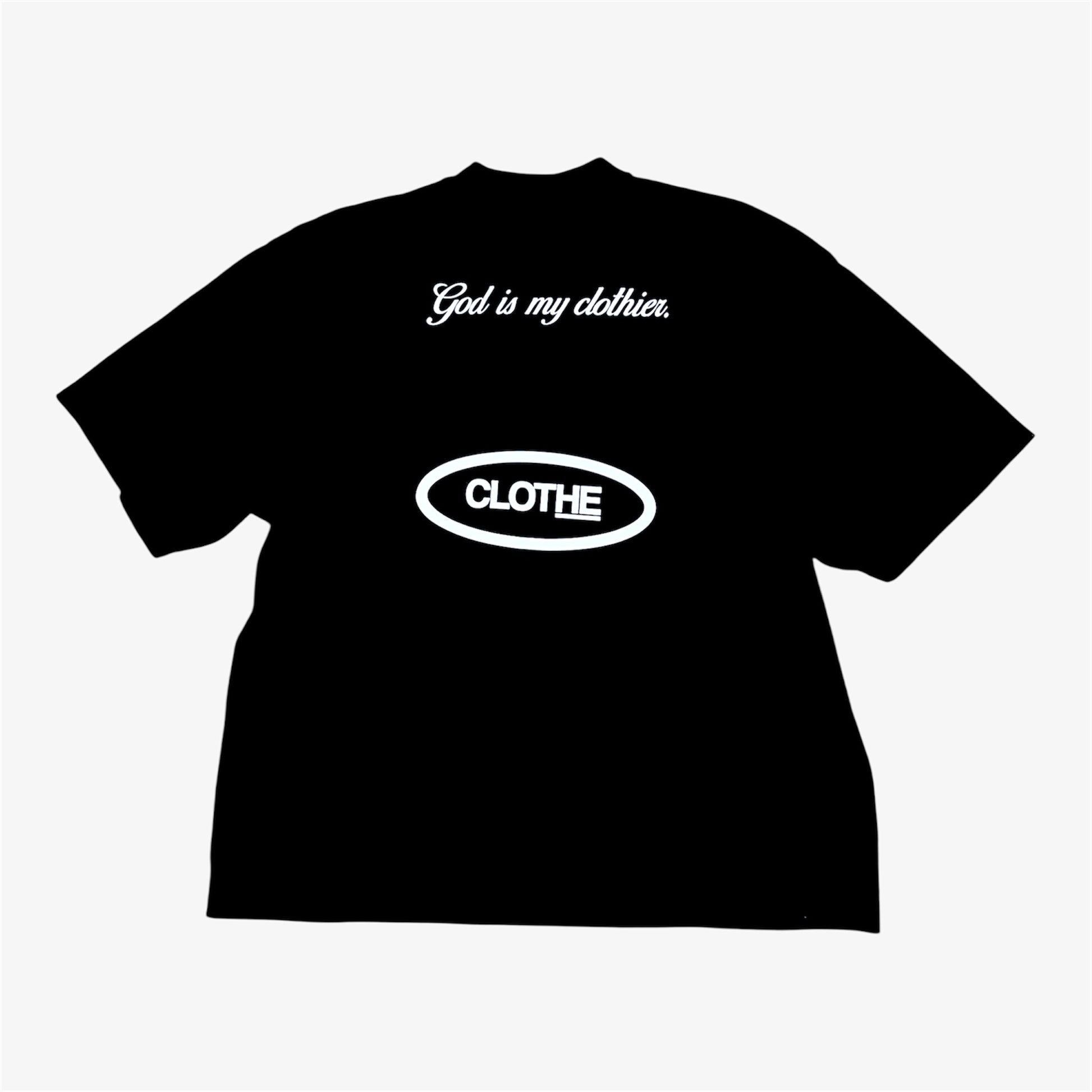 The "God is my clothier." Black Garment Dyed Drop Shoulder T-shirt with White 3m Reflective Vinyl and Cream Vinyl Features: Logos in 3m reflective vinyl on the front and back with the statement "God is my clothier." Halo design in white 3m reflective Vinyl with the new Clothe_ Halo Logo in 3m reflective vinyl. Clothe_ pin attached.